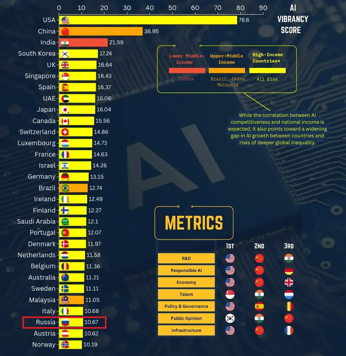 🏆 На инфографике - рейтинг стран по развитию ИИ. Применен сложный (хотя как по мне не идеальный) скоринг, включающий инвестиции в отрасль (в т.ч. государственные), лояльность законодательства, прибыль от использования,, наличие крупных компаний, кадров и т.д.