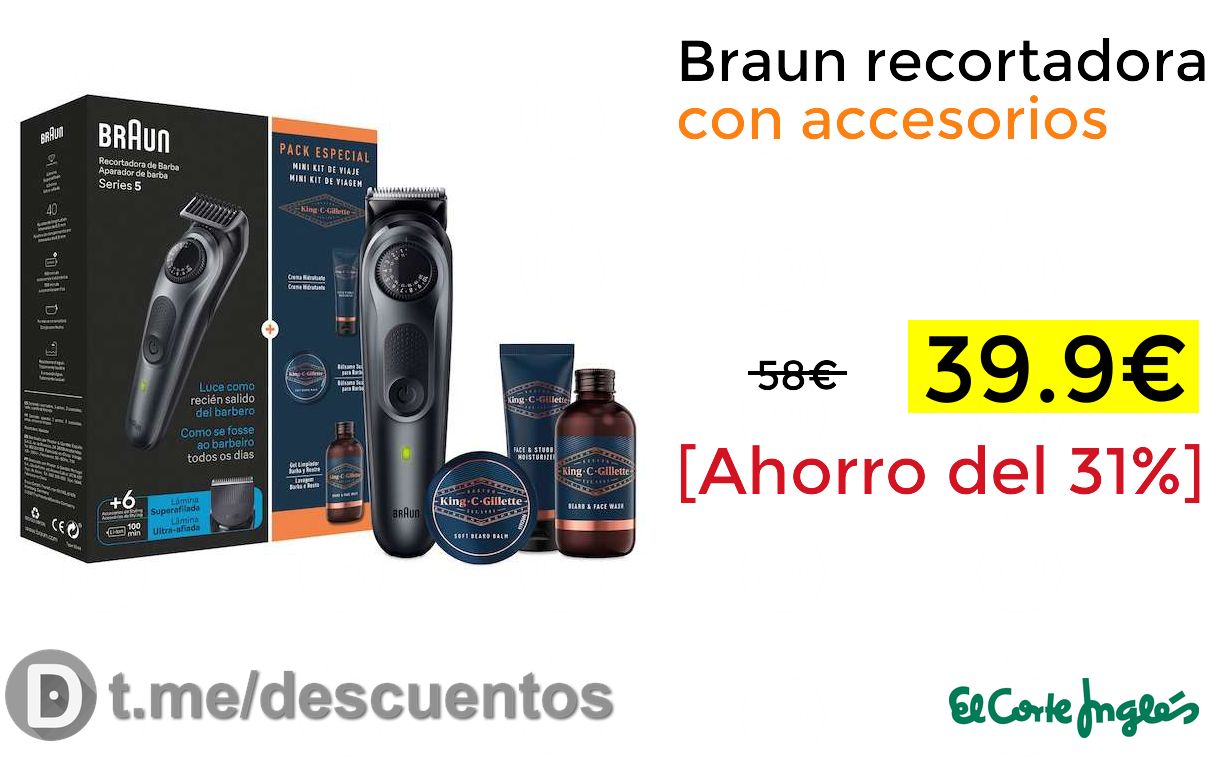 ✨Buen precio para esta recortadora de Braun, es el modelo BT5450 con 40 ajustes de longitud para adaptarse a las necesidades de cada momento. Además, nos incluye un set de cuidado personal de King C. Gillette.