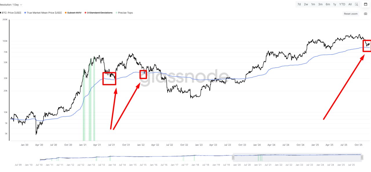 • Индикатор истинной рыночной цены (True market mean price), к которому я обращаюсь достаточно редко (что логично, т.к. в последний раз он давал сигналы только в 2021-2022 гг.), вновь начал давать сигналы с 21 ноября