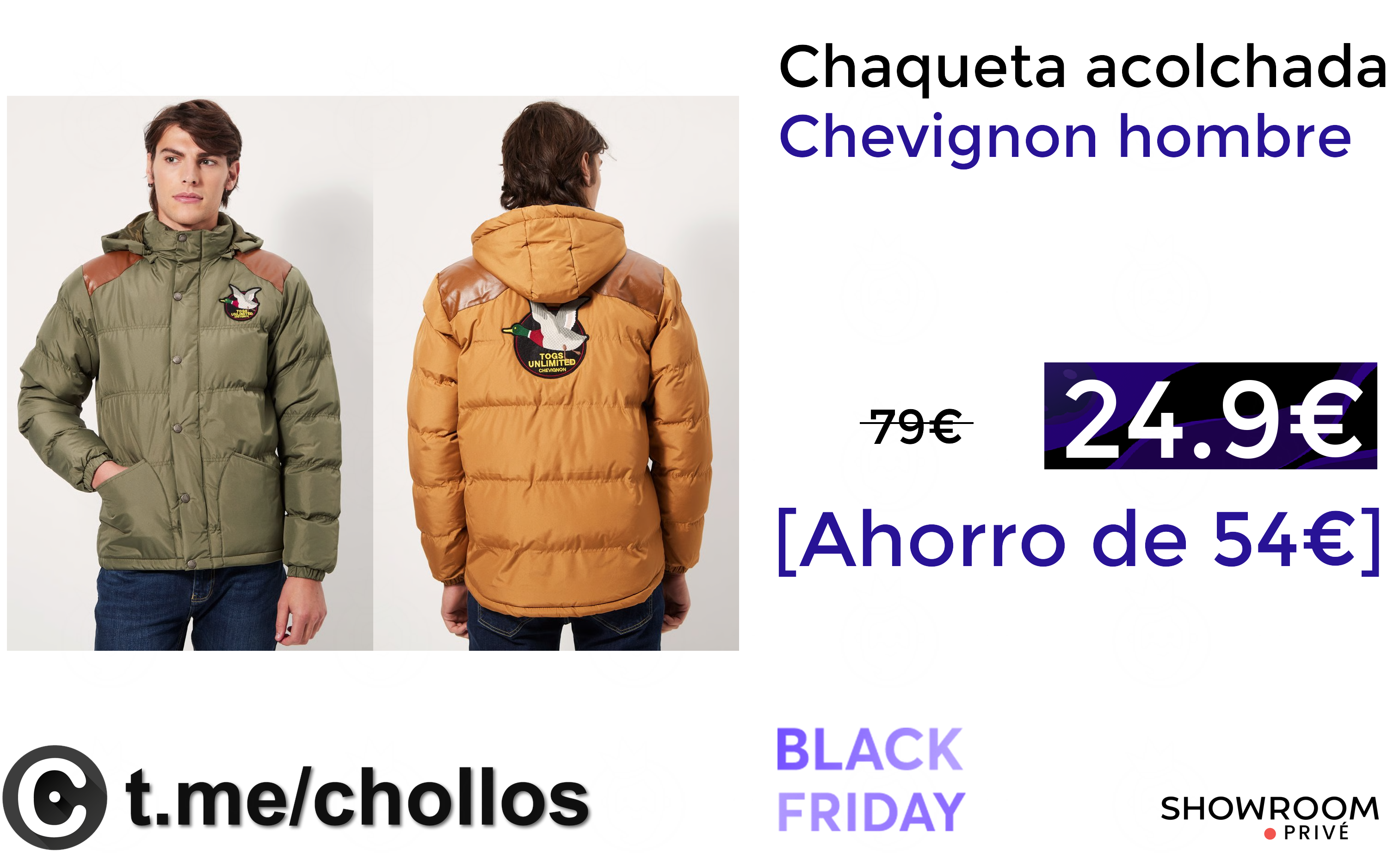 ✨Preciazo en el outlet de Showroomprivé para esta chaqueta acolchada para hombre, de la marca Chevignon. Con cuello alto, capucha y bolsillos laterales, cuenta con el escudo bordado en el lateral del pecho y la espalda. Está disponible en varios colores y en tallas desde la S hasta la 2XL, según color.