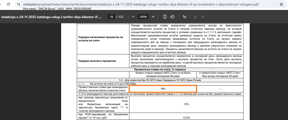 ▶️ "МТС счёт" от "МТС Банка" (ежед.) с 24.11.25 — 18% годовых новичкам в первые два месяца на ежедневный остаток до 5 млн руб. (с пакетом "Премиум" — 18% годовых на ежедневный остаток до 10 млн руб.). Не должно быть вкладов в прошлые 90 дней, повторно новичком не стать.