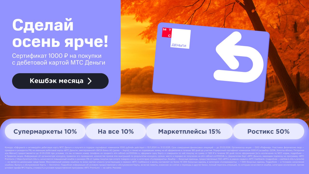Если заказать бесплатную дебетовую карту "МТС Деньги" от "Экси-Банка" по этой ссылке и сделать первую покупку от 500 руб. (кроме списка исключений) в течение первых 30 дней, то в подарок будет положен сертификат на 1000 руб. на выбор в OZON/Золотое Яблоко/Магнит/Пятёрочка. Актуально для клиентов, у которых не было карты "Экси-Банка" и заявок на неё в прошлые 6 месяцев.