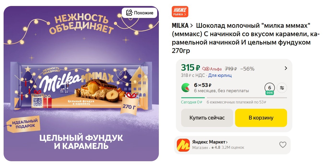• Шоколад Milka "мммах", 270 г за 315₽. Большая пачка молочного шоколада с миндальной и карамельной начинками. Другие вкусы: https://hlv.su/13w78